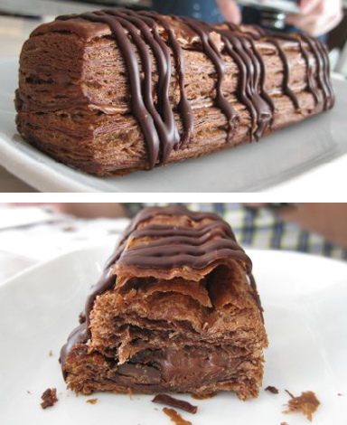 La consistenza morbida (burrosa) e croccante della pasta sfoglia, aromatizzata al cacao, sommato all’intenso sapore di cioccolato al latte della crema che si confonde col gusto di cioccolato fondente che avvolge la crema stessa… una bomba! $3.75 di piacere allo stato puro 😀